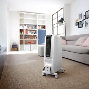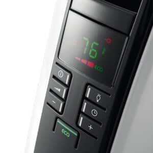 Maximize your comfort with the 1500-watt TRD40615E De’Longhi radiant heater, featuring a digital control panel and 24-hour timer. An exclusive ECO function optimizes energy consumption by regulating power flow and temperature, while a powerful convection heating effect distributes warm air faster and more effectively. Uniquely designed to deliver 75% more radiant surface area, this oil-filled radiator maximizes gentle heat that won’t dry out your air or stir up allergens. Enjoy effortless portability with ergonomic handles and SmartSnap wheels, as well as the security of a child lock, thermal cut-off, and other built-in safety elements.