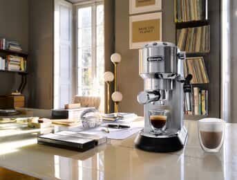 Machine à café élégante et compacte qui parfait le plan de travail de votre cuisine. Avec son corps en acier inoxydable et sa finition en métal brillant, la machine espresso Dedica ajoute une touche de design italien à toutes les cuisines. Dégustez un espresso riche et onctueux et utilisez le système cappuccino réglable pour chauffer le lait ou terminer votre café avec une mousse de lait crémeuse.