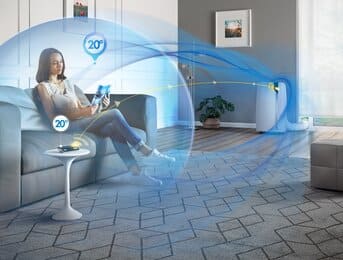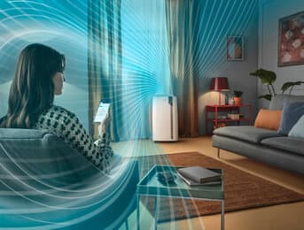 Houd de controle over uw persoonlijke comfort: pas het aan jouw voorkeuren en activiteiten aan via MyEcoRealFeel, terwijl je tot 30% energie bespaart3. Houd de slimme afstandsbediening bij jou in de buurt en de Cool Surround™-technologie levert de precieze mate van koeling, exact daar waar je bent. Het handige draagbare apparaat heeft zowel ventilator- als ontvochtigingsfuncties en is tot 50% stiller5 dankzij Silent Technology.